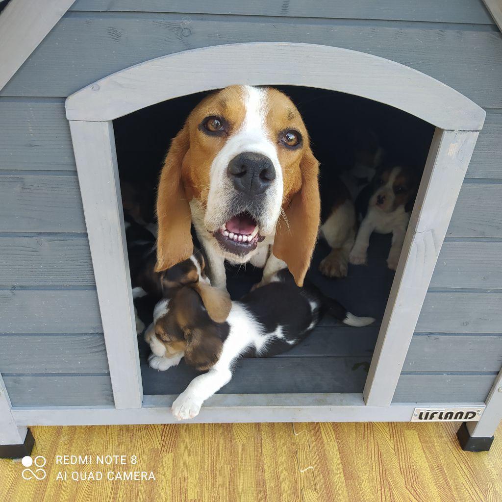 Nectarine du Rallye Juigné avec ses chiots, juin 2021